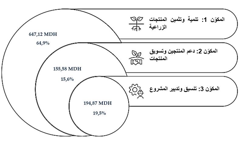 يتمحور مشروع PADERMO حول مكونين رئيسيين يهدفان إلى تعزيز صمود وإنتاجية الاستغلاليات الزراعية في جهة الشرق، مع دعم تثمين وتسويق المنتجات المحلية. يوضح المخطط التالي مكونات المشروع إضافة إلى مكوناته الفرعية.